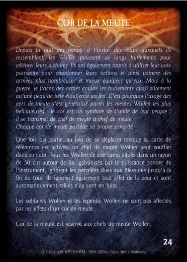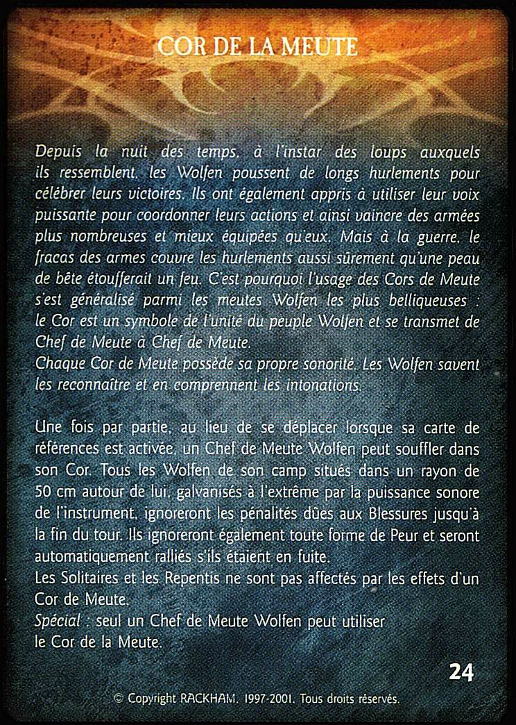 Une fois par partie, au lieu de se déplacer lorsque sa carte de références est activée, un Chef de Meute Wolfen peut souffler dans son Cor. Tous les Wolfen de son camp situés dans un rayon de 50 cm autour de lui, galvanisés à l’extrême par la puissance sonore de l’instrument ignoreront les pénalités dues aux blessures jusqu’à la fin du tour. Ils ignoreront également tout forme de Peur et seront automatiquement ralliés s’ils étaient en fuite.