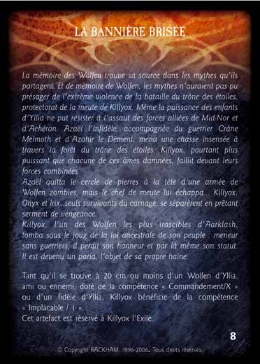 La mémoire des Wolfen trouve sa source dans les mythes qu’ils partagent. Et de mémoire de Wolfen, les mythes n’auraient pas pu présager de l’extrême violence de la bataille du Trône des Étoiles, protectorat du chef de meute Killyox. Même la puissance des Enfants d’Yllia ne put résister à l’assaut des forces alliées de Mid-Nor et Achéron. Azaël l’Infidèle, accompagnée du Guerrier Crâne Melmoth et d’Azahir le Dément, mena une chasse insensée à travers la forêt du Trône des Étoiles. Killyox, pourtant plus puissant que chacune de ces âmes damnées, faillit devant leurs forces combinées. Azaël quitta le Cercle de Pierres à la tête d’une armée de Wolfen zombies, mais le chef de meute lui échappa. Killyox, Onyx et Irix, seuls survivants du carnage, se séparèrent en prêtant serment de vengeance. Mais Killyox, l’un des Wolfen les plus irascibles d’Aarklash, tomba sous le joug de la loi ancestrale de son peuple : meneur sans guerriers, il perdit son honneur et par là même son statut. Il est devenu un paria, l’objet de sa propre haine.
