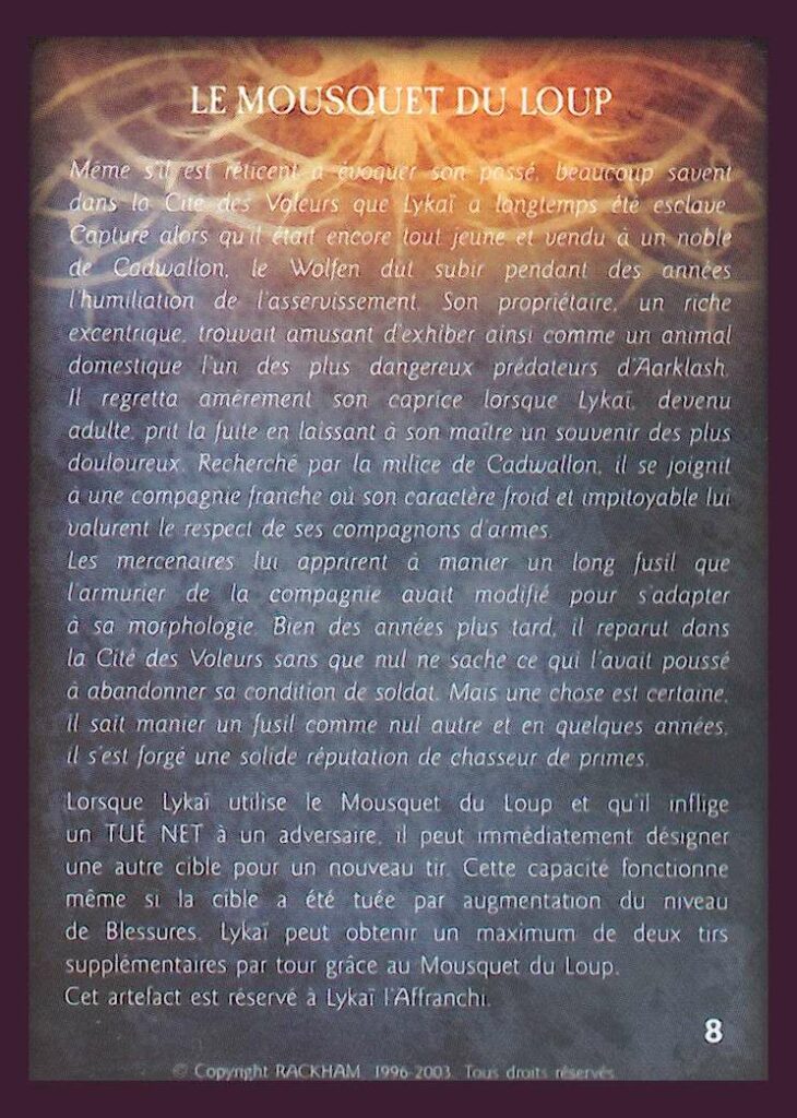 Même s’il est réticent à évoquer son passé, beaucoup savent dans la Cité des Voleurs que Lykaï a longtemps été esclave. Capturé alors qu’il était encore tout jeune et vendu à un noble de Cadwallon, le Wolfen dut subir pendant des années l’humiliation de l’asservissement. Son propriétaire, un riche excentrique, trouvait amusant d’exhiber ainsi comme un animal domestique l’un des plus dangereux prédateur d’Aarklash. Il regretta amèrement son caprice lorsque Lykaï, devenu adulte, prit la fuite en laissant à son maître un souvenir des plus douloureux. Recherché par la milice de Cadwallon, il se joignit à une compagnie franche où son caractère froid et impitoyable lui valurent le respect de ses compagnons d’armes. Les mercenaires lui apprirent à manier un long fusil que l’armurier de la compagnie avait modifié pour s’adapter à sa morphologie. Bien des années plus tard, il reparut dans la Cité des Voleurs sans que nul ne sache ce qui l’avait poussé à abandonner sa position de soldat. Mais une chose est certaine, il sait manier son fusil comme nul autre et en quelques années, il s’est forgé une solide réputation de chasseur de primes.