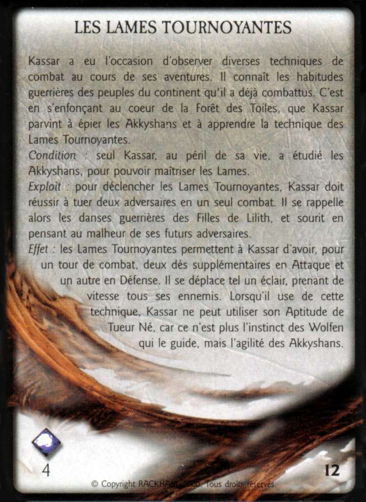 Kassar doit tuer deux adversaires en une seule phase de Corps à Corps. Il atteint alors l’état de d’esprit indispensable à la mise en oeuvre des Lames Tournoyantes. Cette carte est aussitôt utilisable après avoir été gagnée.