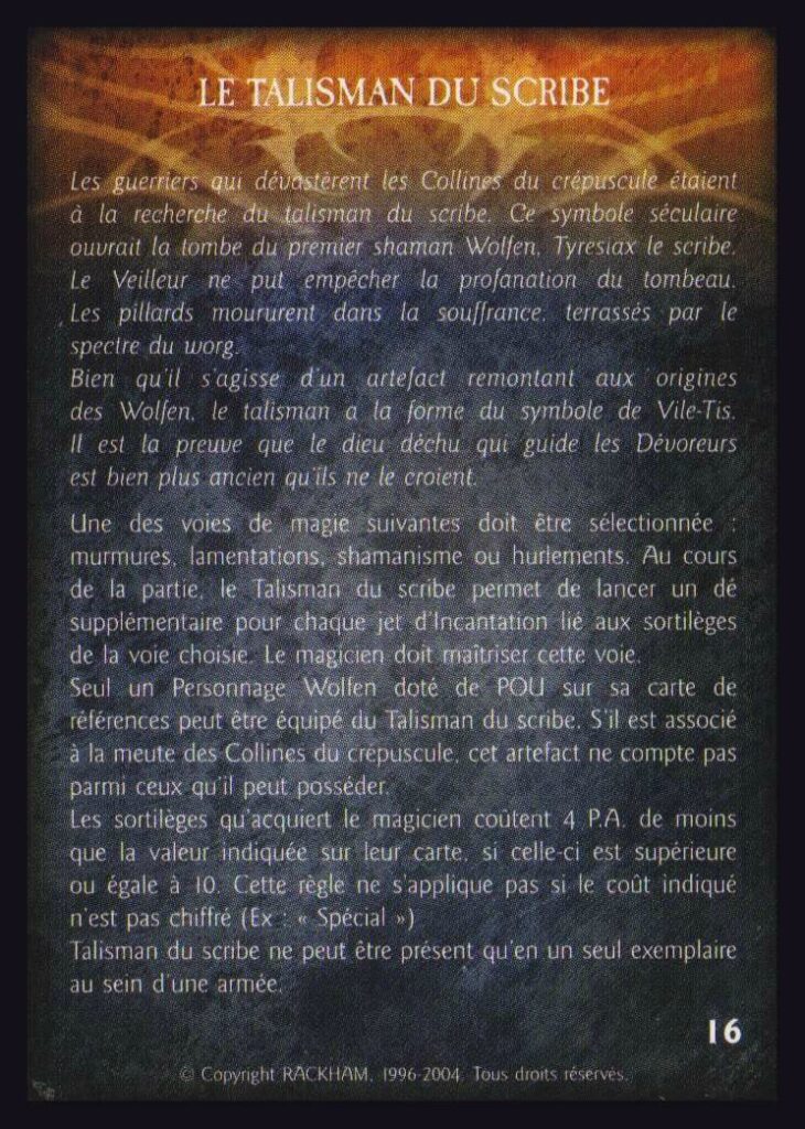 Seul un Incarné Wolfen doté de POU sur sa carte de références peut être équipé du Talisman du scribe. S’il est associé à la meute des Collines du crépuscule, cet artefact ne compte pas parmi ceux qu’il peut posséder.