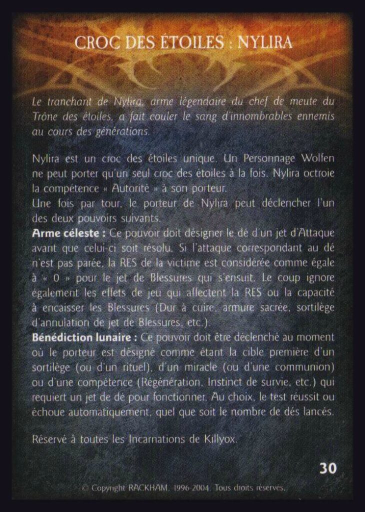 Nylira est un croc des étoiles unique. Un Personnage Wolfen ne peut porter qu’un seul croc des étoiles à la fois. Nylira octroie la compétence Autorité à son porteur. Une fois par tour, le porteur de Nylira peut déclencher l’un des deux pouvoirs suivants.