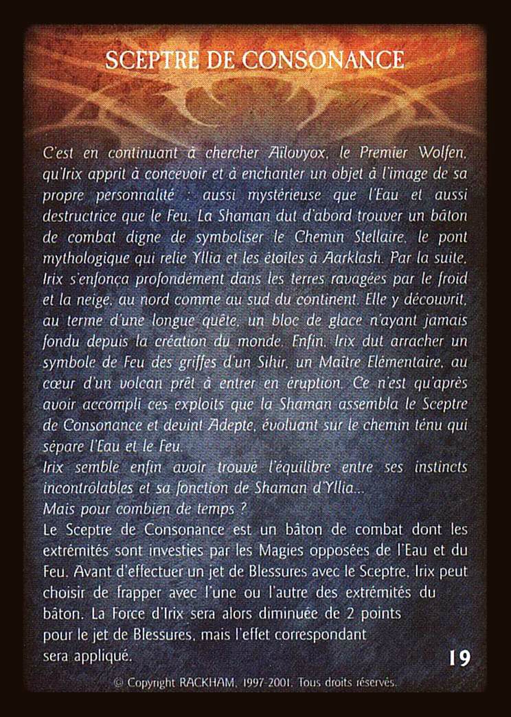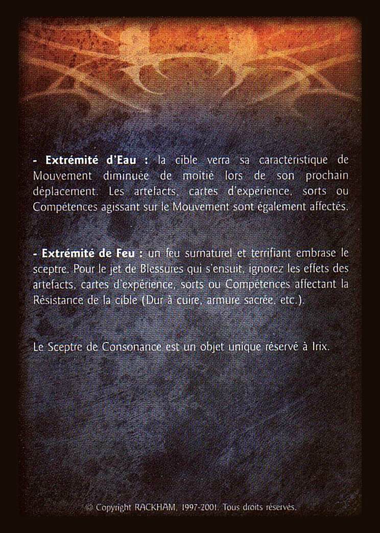 Le Sceptre de Consonance est un bâton de combat dont les extrémités sont investies par les Magies opposées de l’Eau et du Feu. Avant d’effectuer un jet de Blessures avec le Sceptre, Irix peut choisir de frapper avec l’une ou l’autre des extrémités du bâton. La Force d’Irix sera alors diminuée de 2 points pour le jet de Blessures, mais l’effet correspondant sera appliqué.