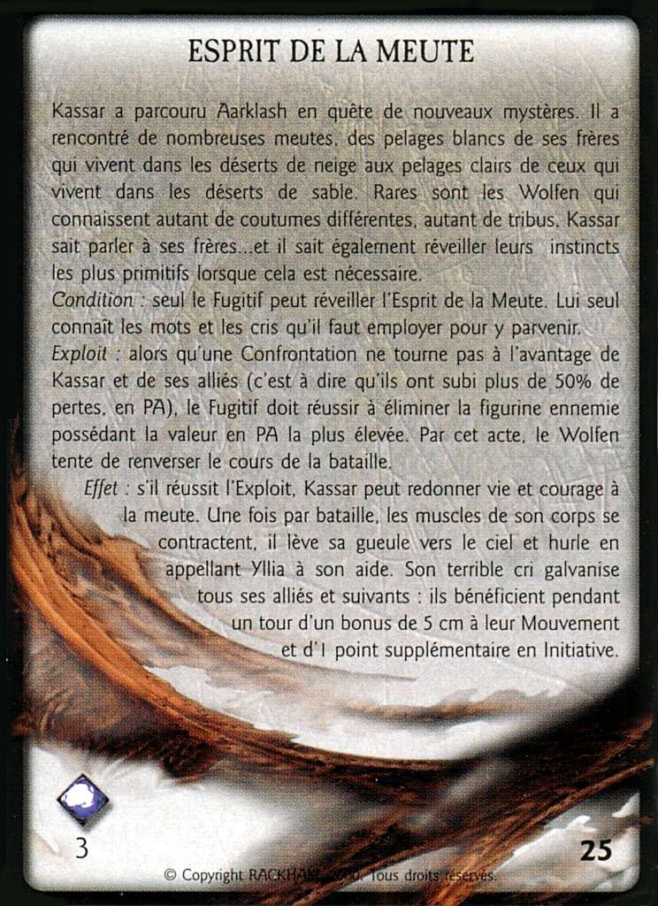 Le hurlement de l’Aventurier redonne vigueur et courage à la meute. La difficulté de tous les Désengagements des Wolfen ou des Dévoreurs de son camp est alors égale à 4 + 1 par adversaire au contact, jusqu’à la fin de la partie.