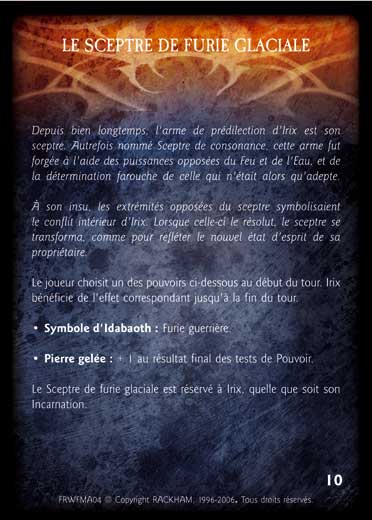 Depuis bien longtemps, l’arme de prédilection d’Irix est son sceptre. Autrefois nommé Sceptre de Consonance, cette arme fut forgée à l’aide des puissances opposées du feu et e l’Eau, et de la détermination farouche de celle qui n’était alors qu’un adepte. À son insu, les extrémités opposées du sceptre symbolisaient le conflit intérieur d’Irix. Lorsque celle-ci le résolut, le sceptre se transforma, comme pour refléter le nouvel état d’esprit de sa propriétaire.